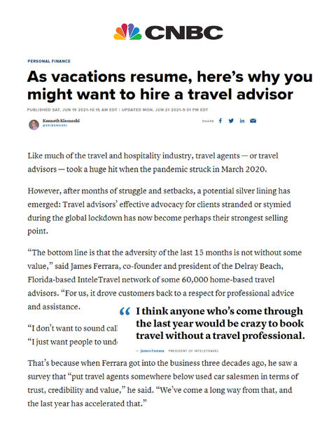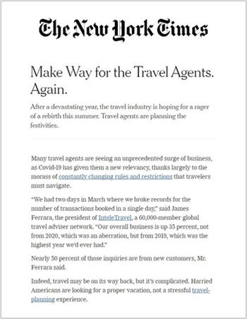 STiR worked quickly to develop a PR and media relations strategy that positioned InteleTravel, its leaders, and its agents as reliable and trusted travel sources in front of top-tier U.S. media, leisure travelers, and consumers. As uncertainty and chaos continued throughout the travel sector, STiR crafted media pitches that leveraged the company’s expertise, timely news topics, and surprising trends, like a surge in cruise sales during shutdowns and the growing demand for travel advisors.